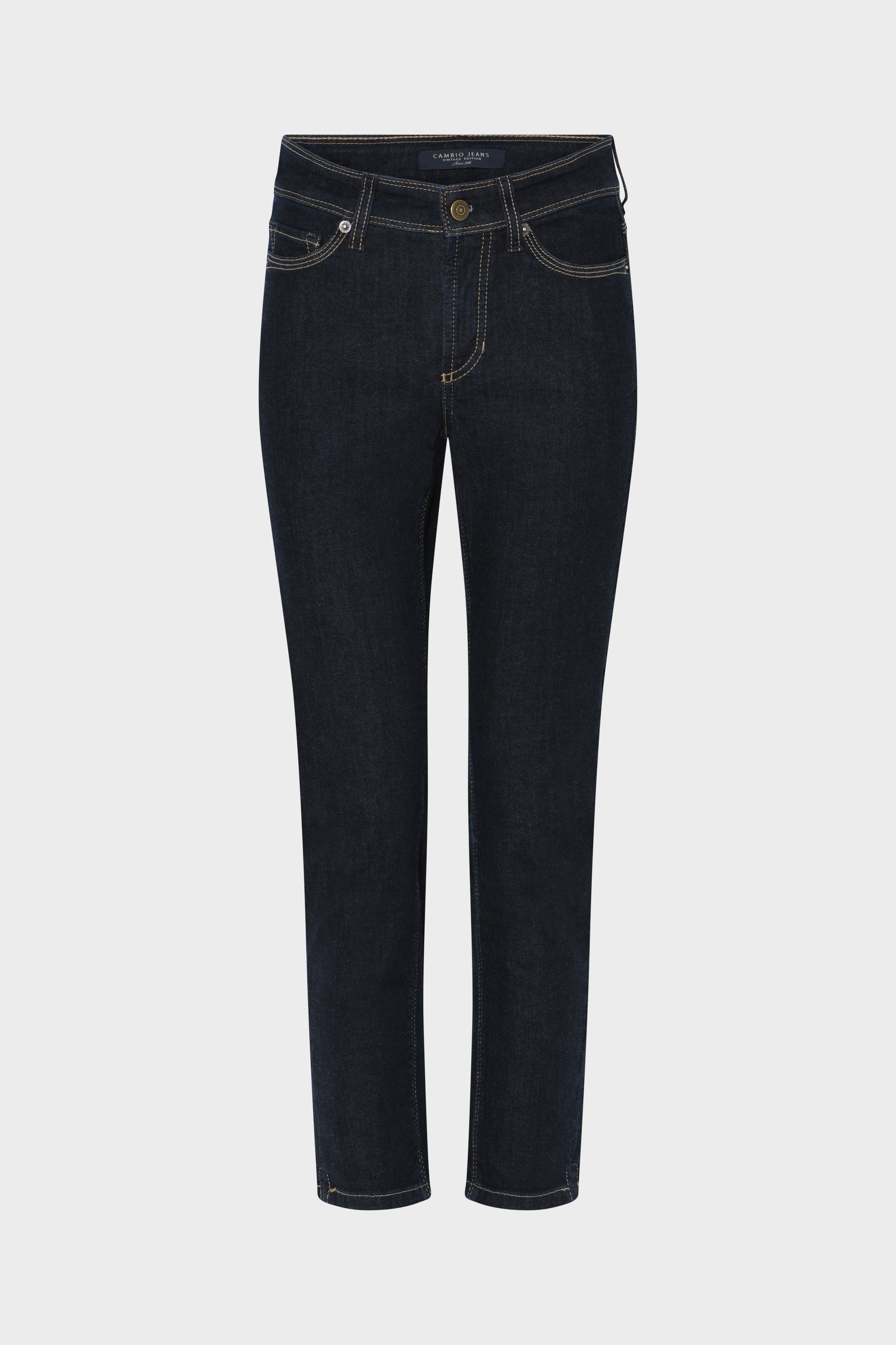 Flot, klassisk buks fra Cambio  Piper Short. Modellen er en klassisk 5 – lommers. Har høj talje, smalle rette ben. Har lille slids forneden ved anklen. Er ankel kort – 27 tommer. Kvalitet 93 % bomuld, 5 % polyester, 2 % elasthan. Farve mørke blå. Slank facon. Vaskeanvisning 30 grader