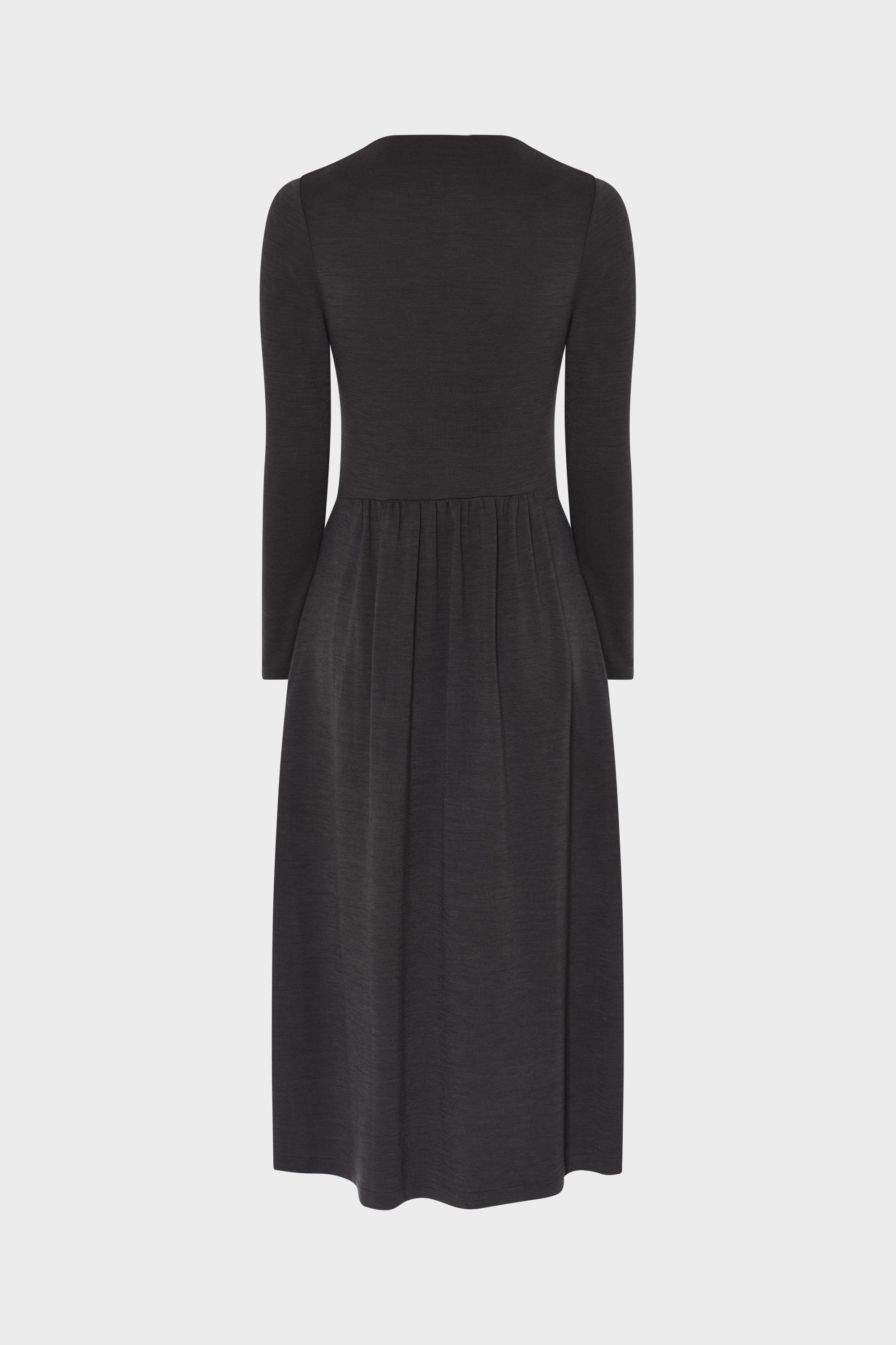 Flot, feminin lang uld kjole fra Elise Gug. Kjolen har lille rund hals udskæring, og langt slank påsat ærme. Kjolen er gennem knappet hele vejen ned foran. Kan bruges både som kjole og som en åbenstående frakke -kjole. Er skåret i taljen med svag rynke effekt. Har skjulte lommer i sidesømmen. Er i hendes kendte uld kvalitet, hvor alt ulden er på ydersiden, og har polyamid på bagsiden. Kvalitet 100 % uld på ydersiden, 100 % polyamid på indersiden. Farve mørkebrun. Størrelse 130 cm fra skuldersøm til kant forneden, bryst vidde 40 cm i str 34.  Vaskeanvisning håndvaskes.