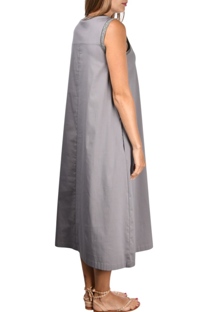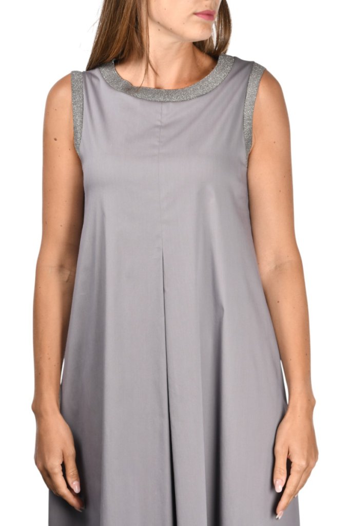 Kjolen har rund halsudskæring og er uden ærmer. Har skjulte lommer i sidesømmen, samt stort skjult læg foran på kjolen. Har rib kant med lurex tråd i halsudskæring og i ærmegab. Kvalitet 78 % bomuld, 18 % polyamid, 4 % elasthan.