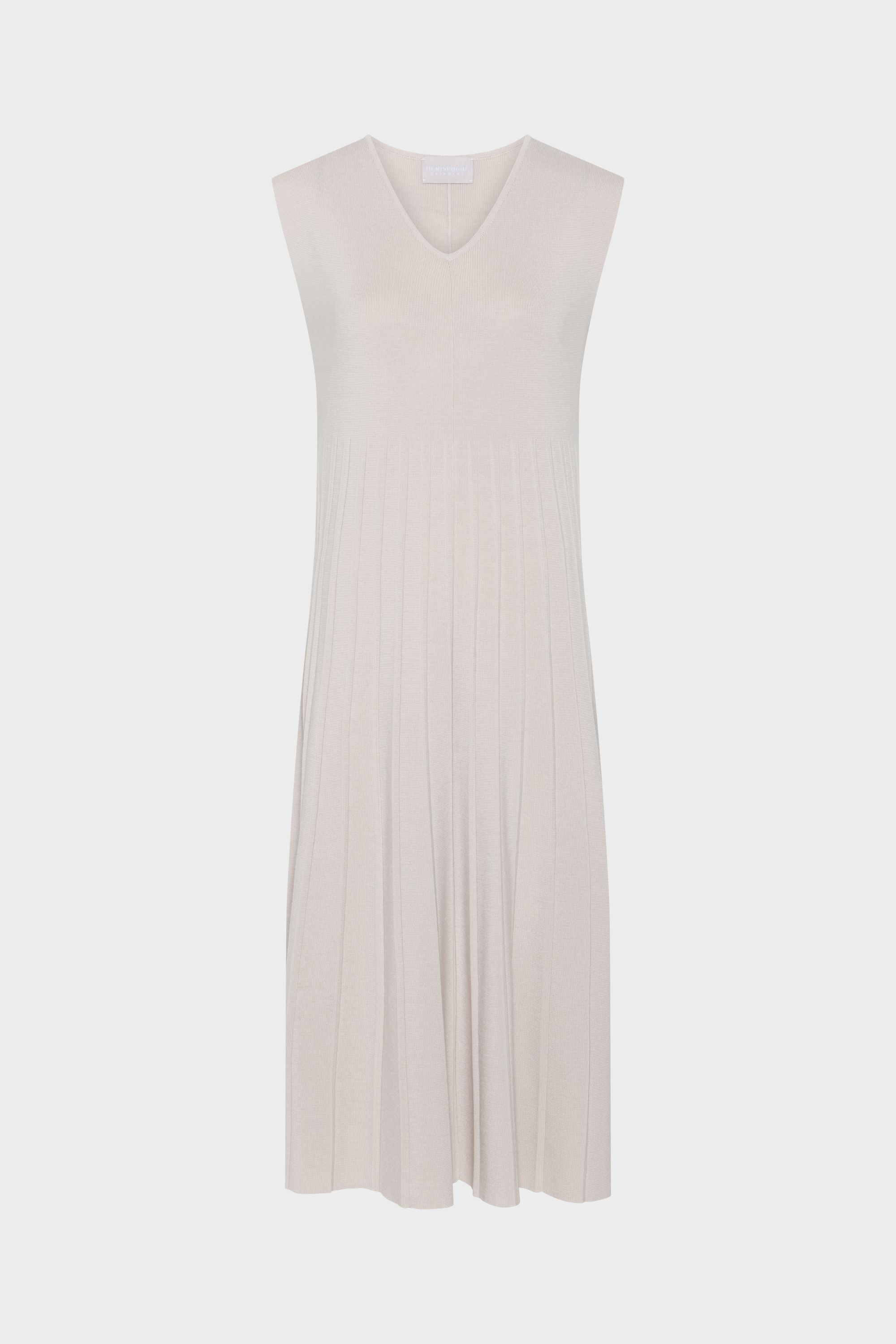 Modellen er uden ærmer og med V-udskæring. Er plisseret fra taljen og ned. Kvalitet 100 % uld. Farve lys sand. Størrelse 124 cm fra skuldersøm til kant forneden, brystvidde 42 cm i str 36.