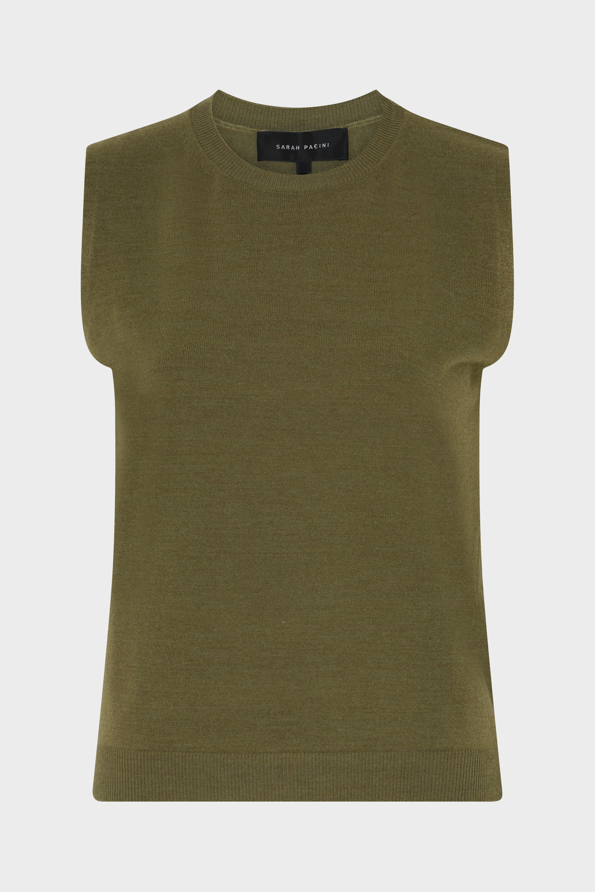 Smuk, feminin strik vest fra Sarah Pacini. Modellen har rund halsudskæring og er uden ærmer. Har smal rib forneden, og ved ærmegab og i halsen. Kan bruges som vest, men også som top under jakke eller cardigan. Slank silhuette. Kvalitet 45 % viscose, 28 % polyester, 27 % polyamid. Farve army. Størrelse 57 cm fra skuldersøm til kant forneden, brystvidde 44 cm. One size. Vaskeanvisning håndvaskes