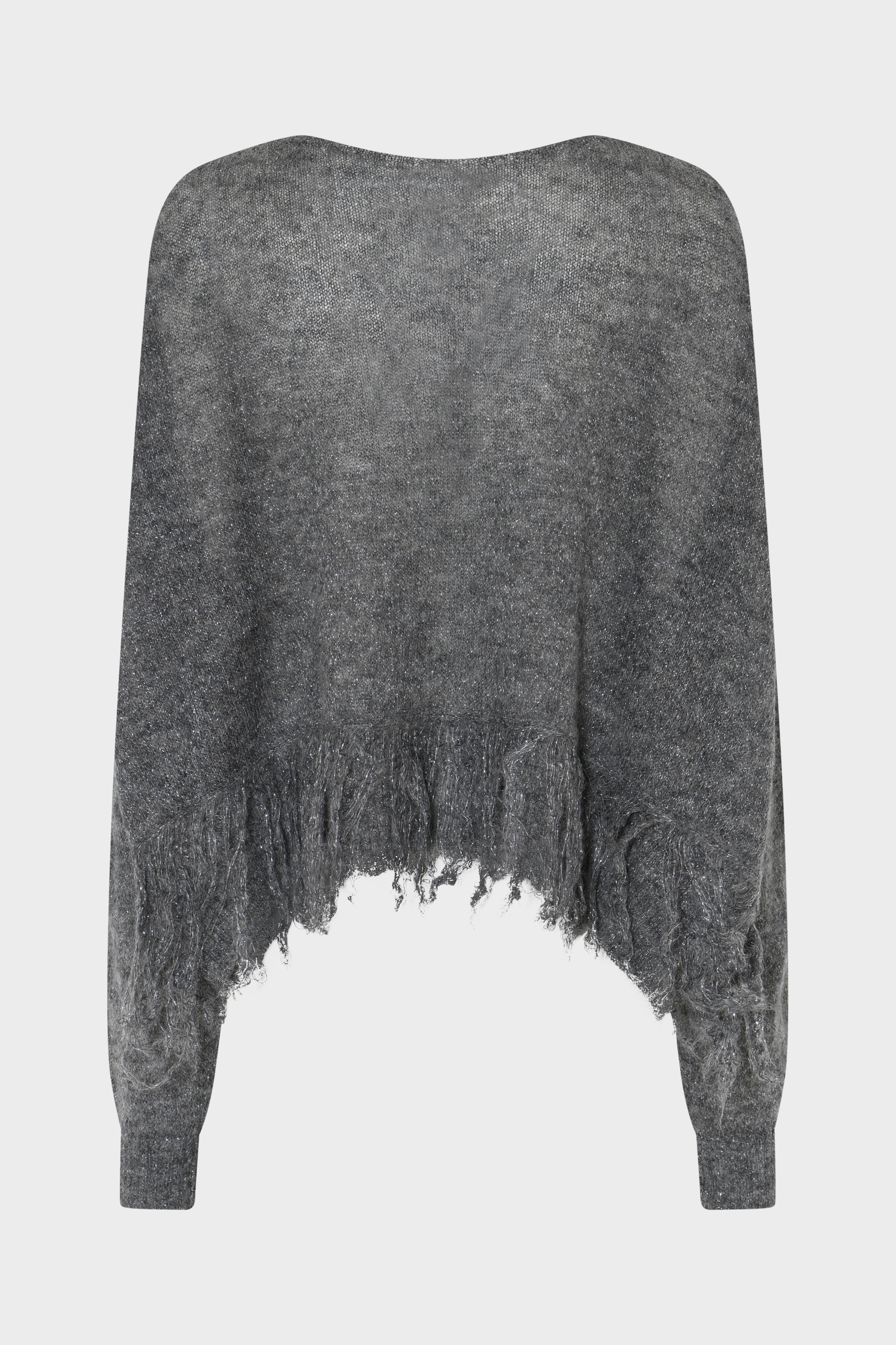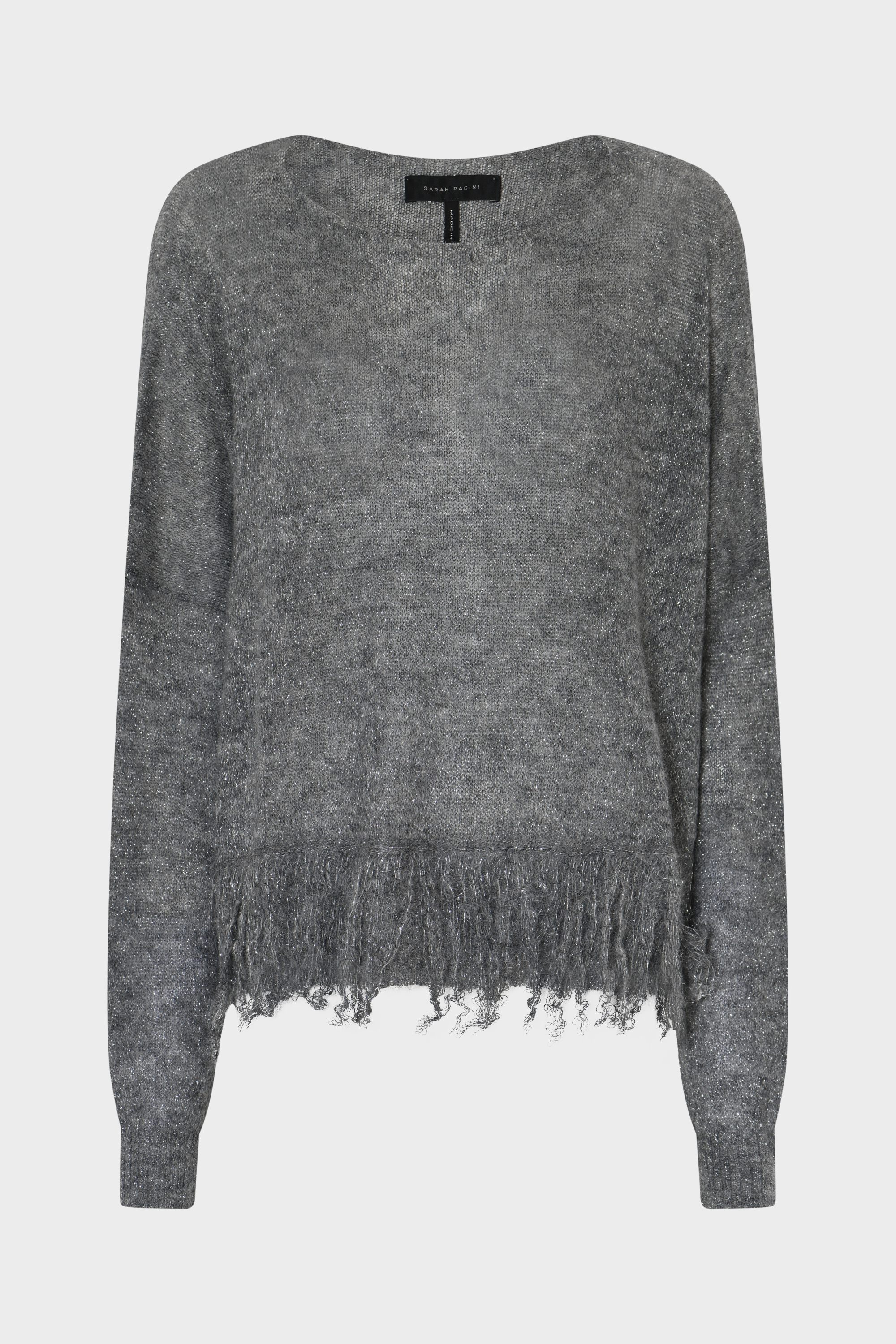 Denne elegante og festklare strikbluse fra Sarah Pacini er designet til at tilføje et strejf af glamour til din garderobe. Med sin bådformede halsudskæring og de delikate lurex-tråde, tilbyder denne bluse en smuk glans, der er perfekt til særlige lejligheder. Den brede silhouette og de charmerende frynser forneden fuldender det stilfulde look.