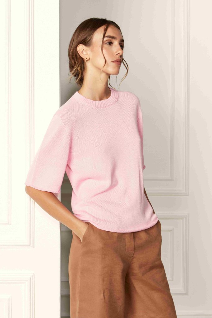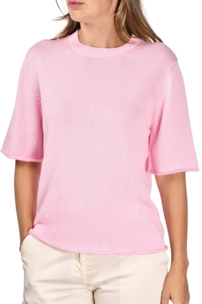 Bred silhuet. God erstatning for en almindelig T-shirt, særlig når du vil være lidt mere påklædt. Kvalitet 100 % bomuld. Farve lyserød. Størrelse 62 cm fra skuldersøm til kant forneden, brystvidde 50 cm i str XS.