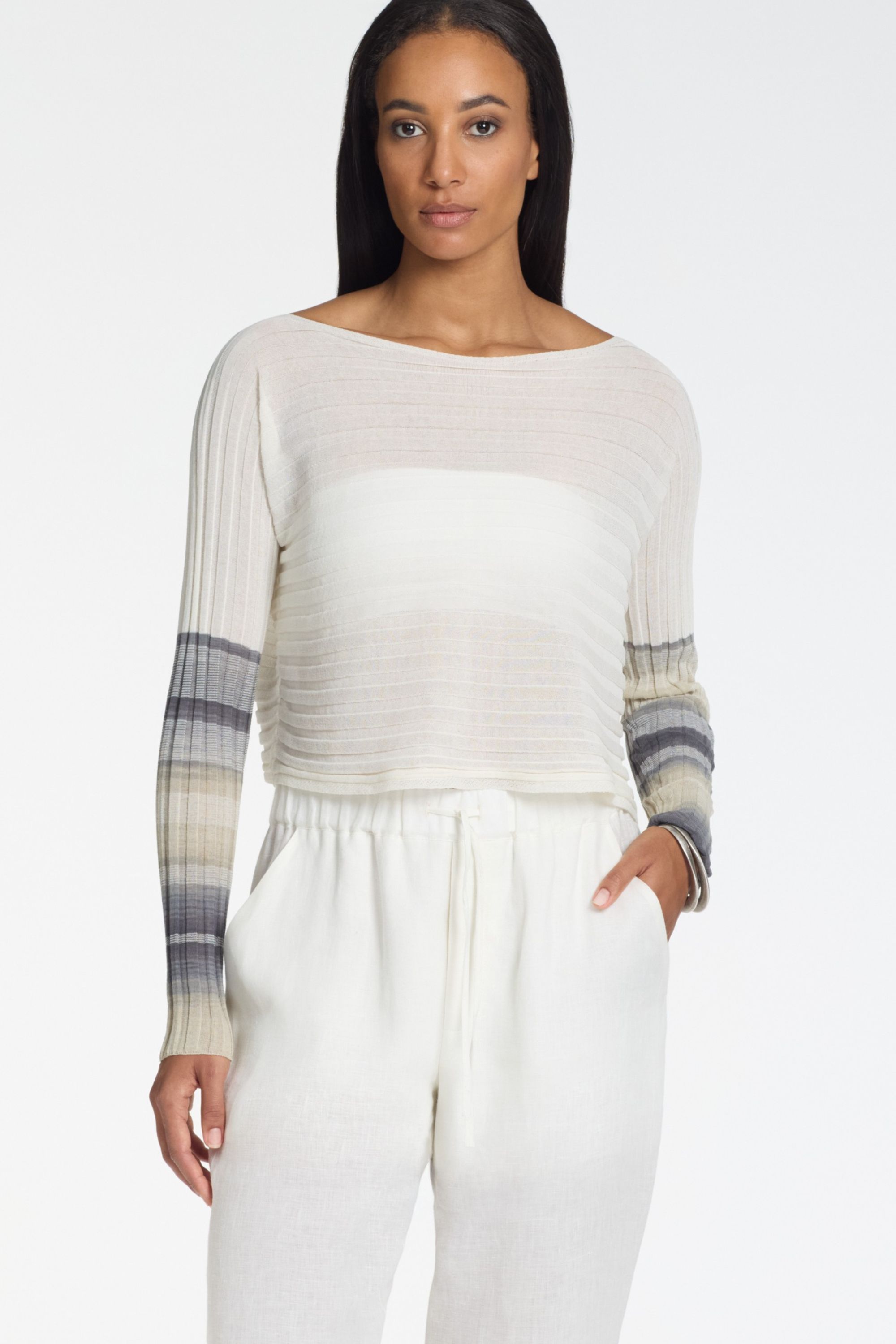 • Har en bred bådformet halsudskæring og lange, slanke påsatte ærmer.