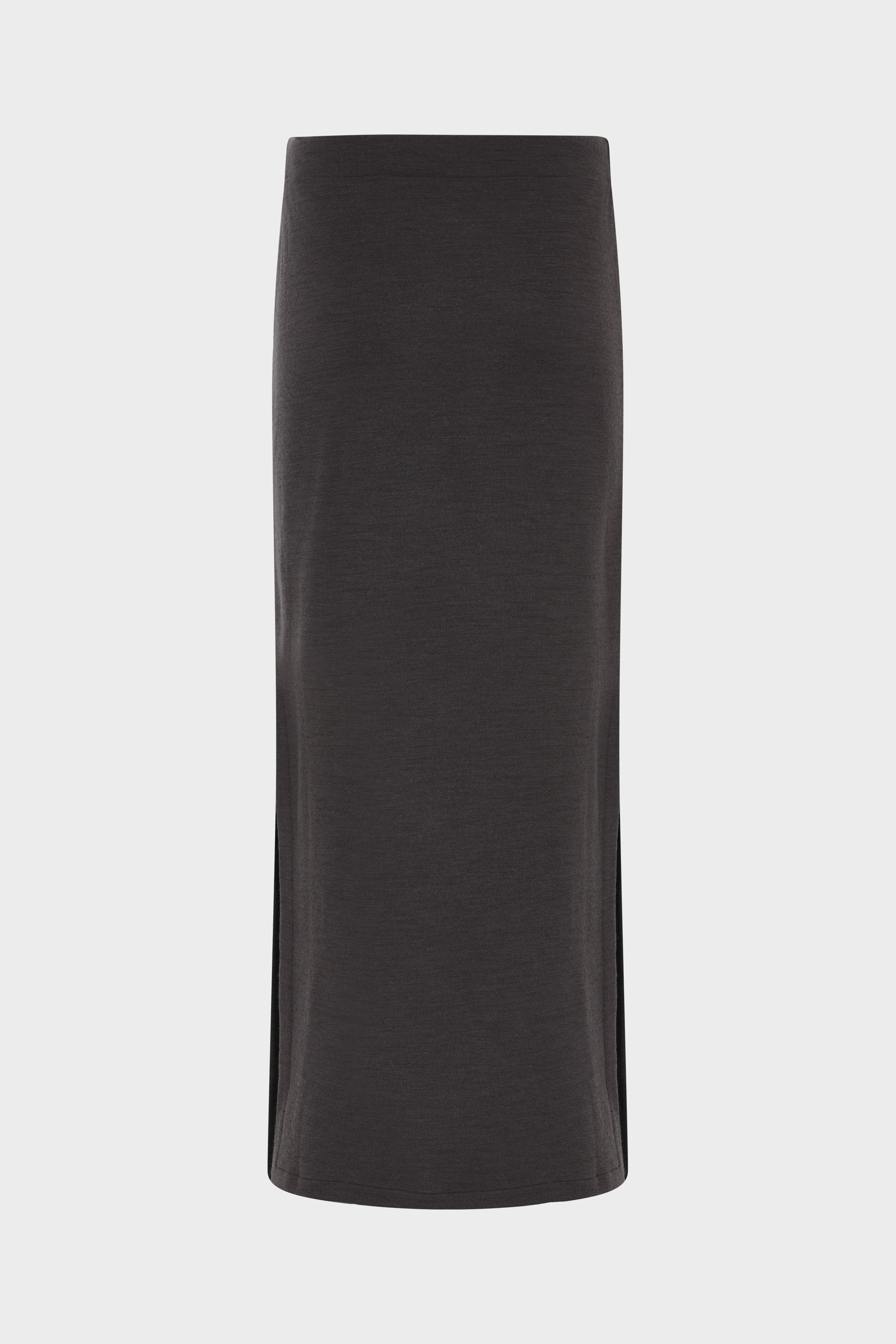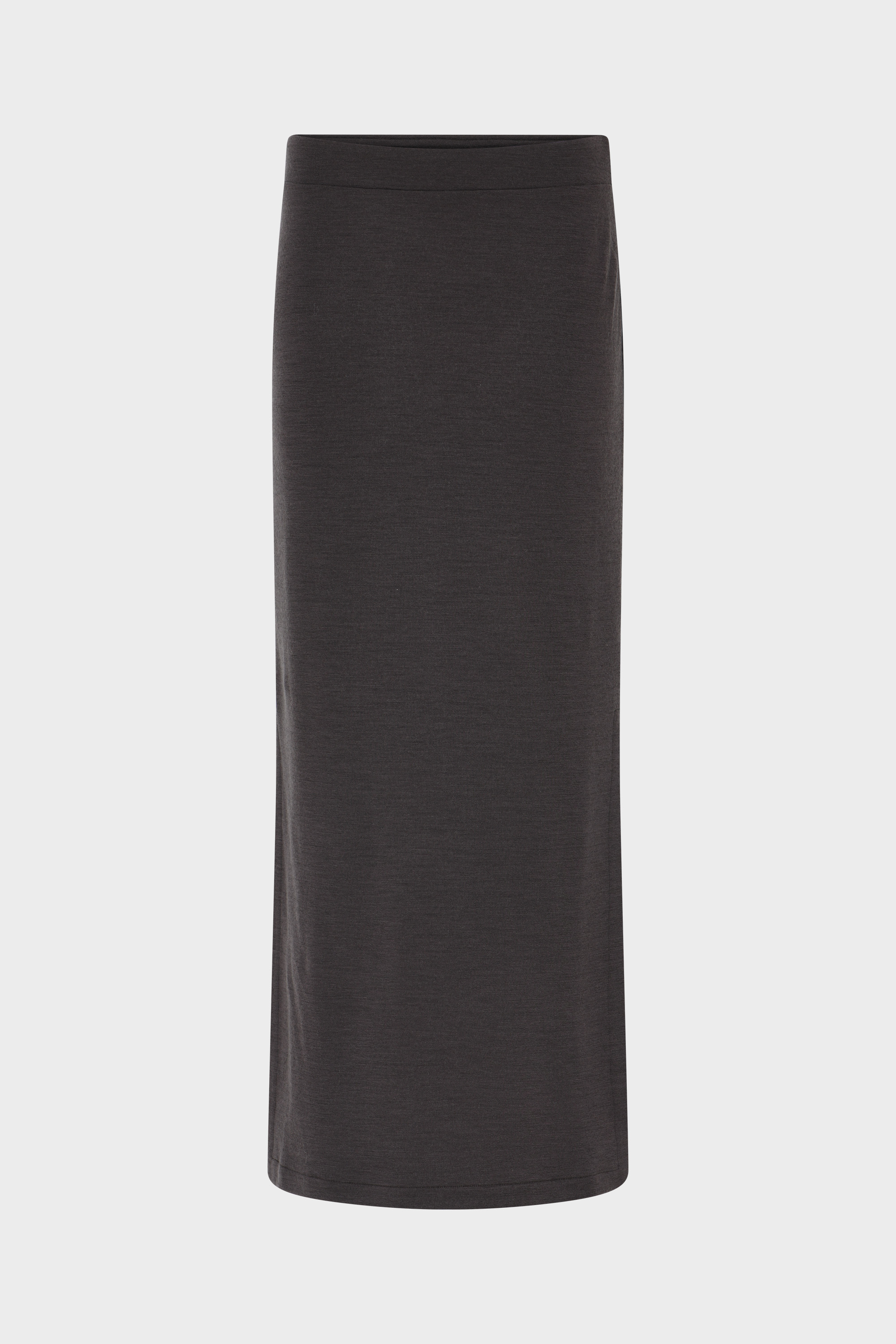 Denne ankel-lange pencil skirt fra Elise Gug kombinerer klassisk elegance med komfort. Designet med høje slidser på begge sider, fremstår nederdelen både stilfuld og praktisk, perfekt til både kontoret og aftenarrangementer. Den mørkebrune farve og det rene uldmateriale sikrer et eksklusivt udtryk.