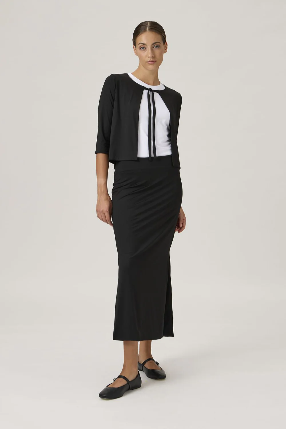 • Skinnebenslængde med dybe slidser i begge sidesømme.