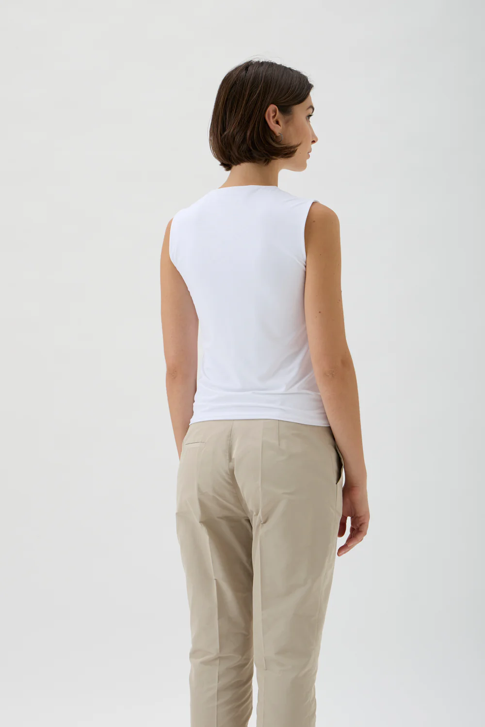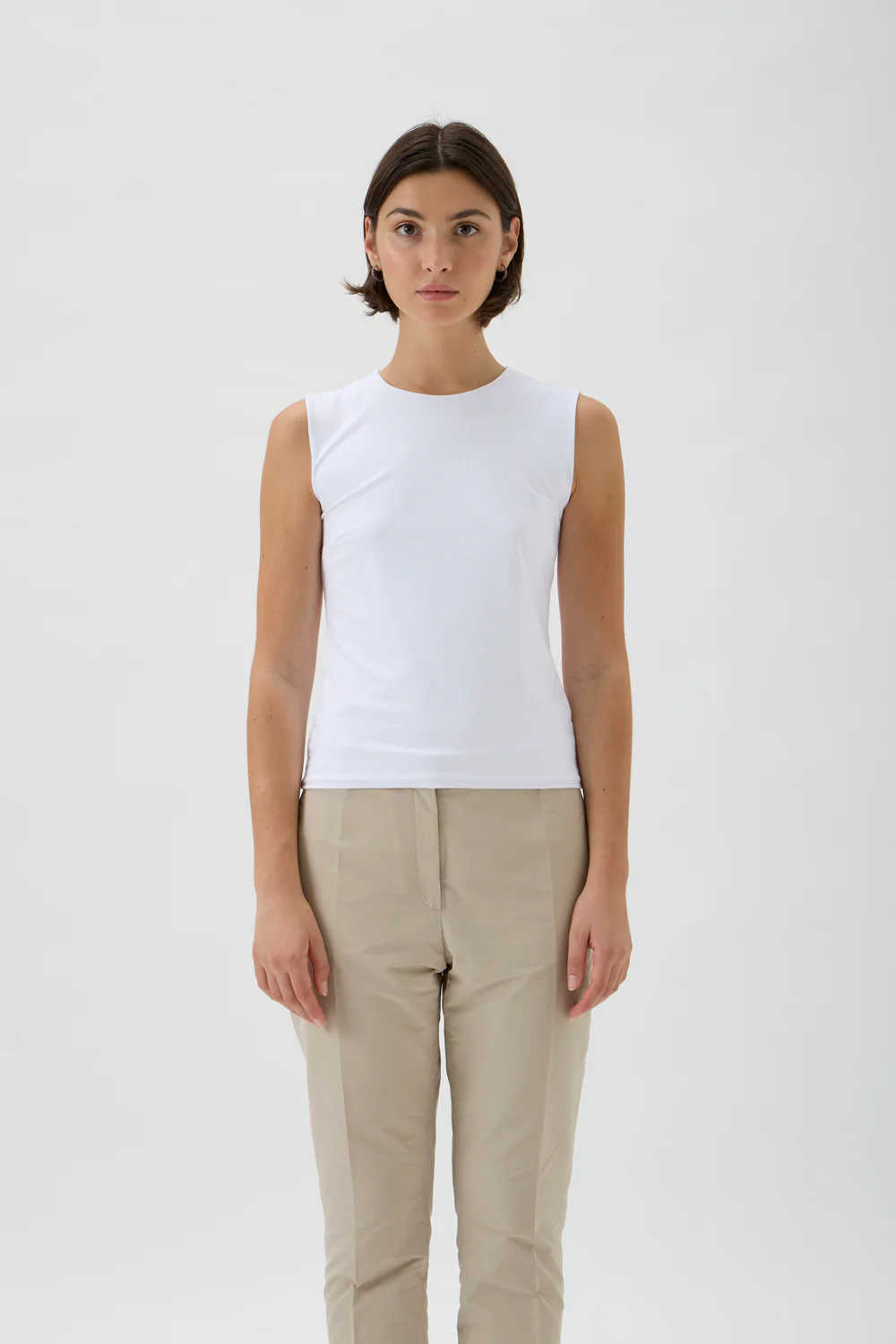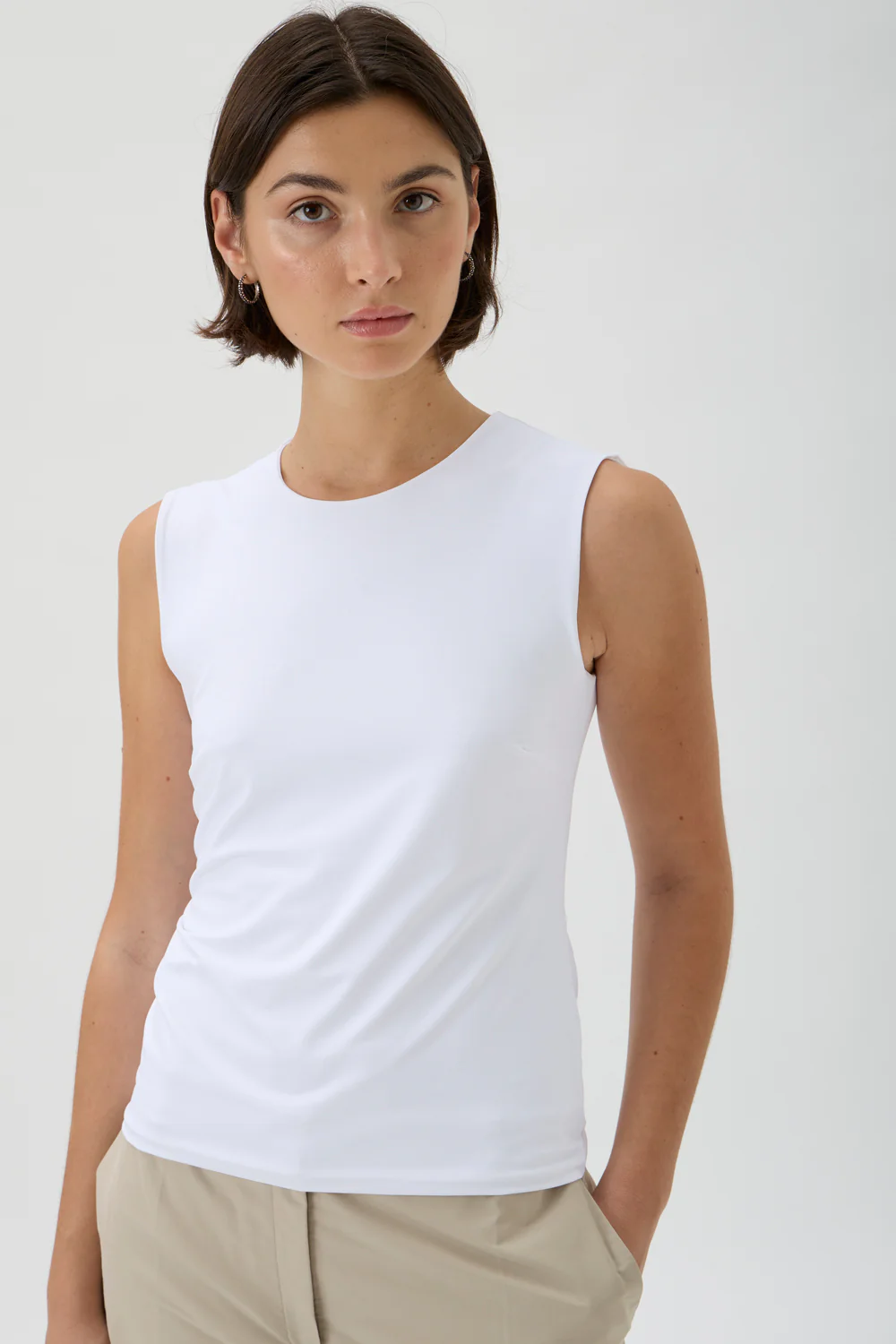 Kvalitet 86 % polyamid, 14 % elasthan. Farve hvid. Størrelse 54 cm fra skuldersøm til kant forneden, brystvidde 38 cm i str 34.