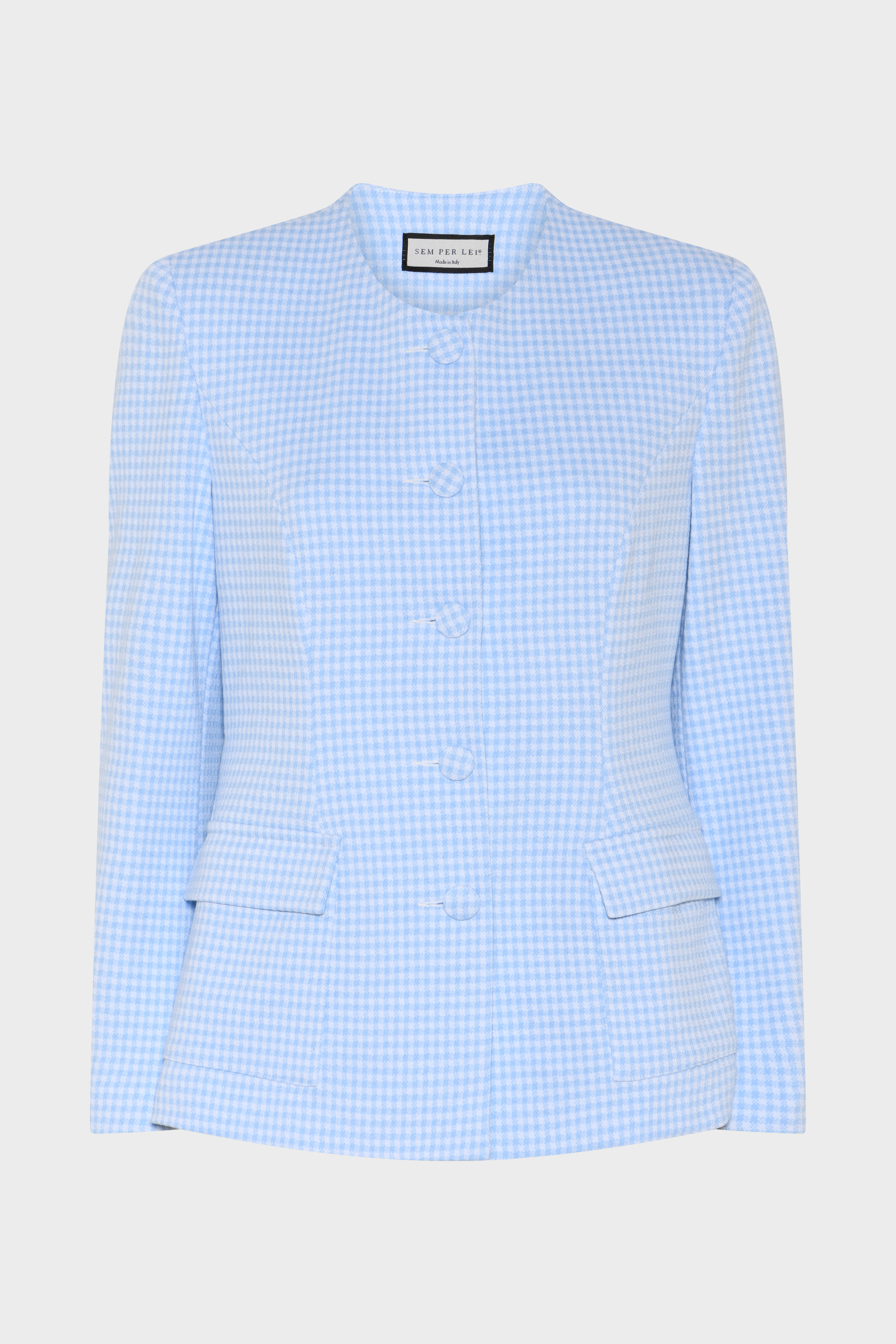 Opdag elegance og komfort med denne flotte, klassiske habitjakke fra Sem Per Lei. Designet uden krave men med en stilfuld rund halsudskæring, er denne jakke ideel til både kontor og formelle sammenkomster. Den lyseblå ternede farve tilfører et frisk pust til den traditionelle habitjakke.