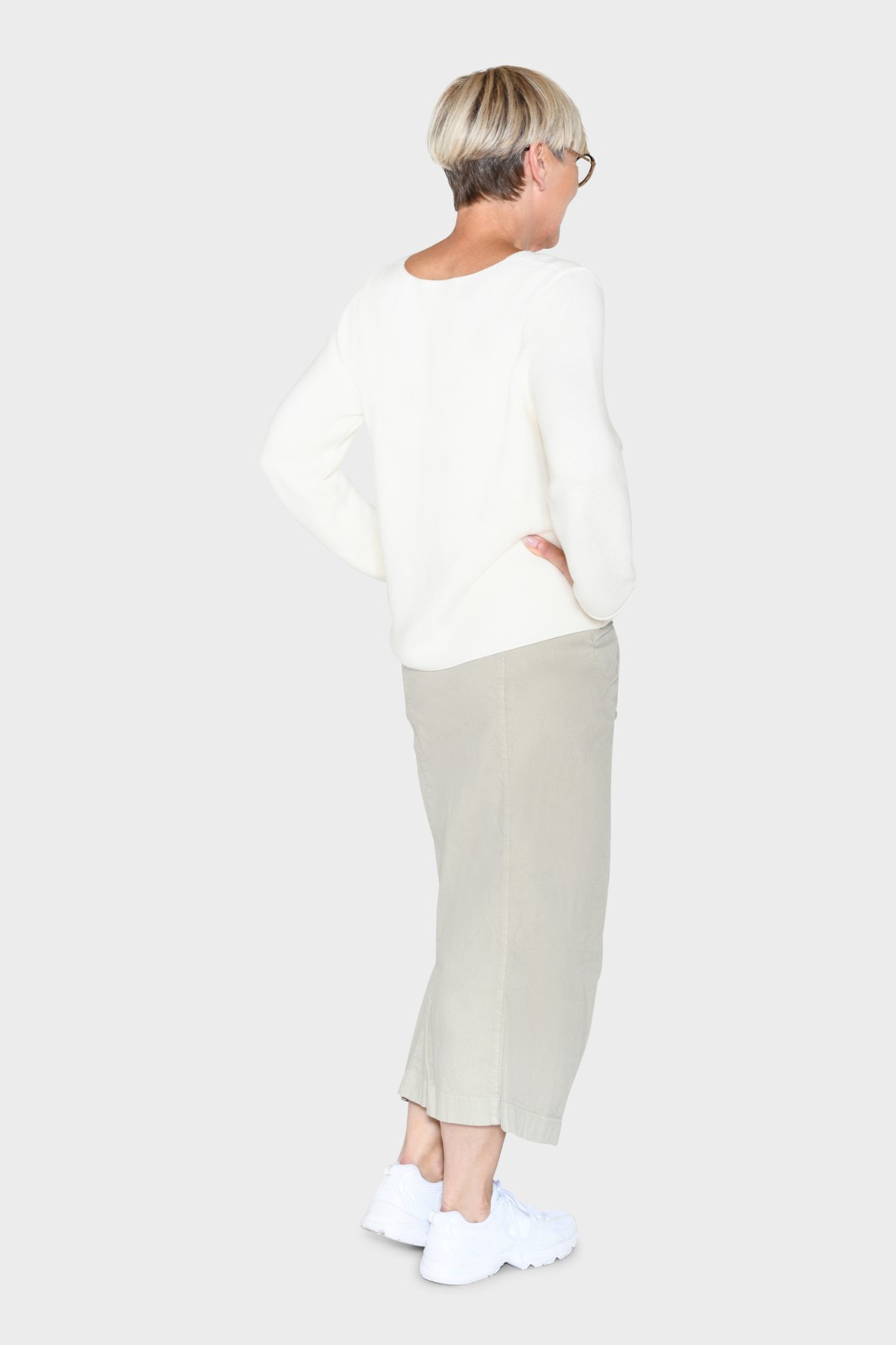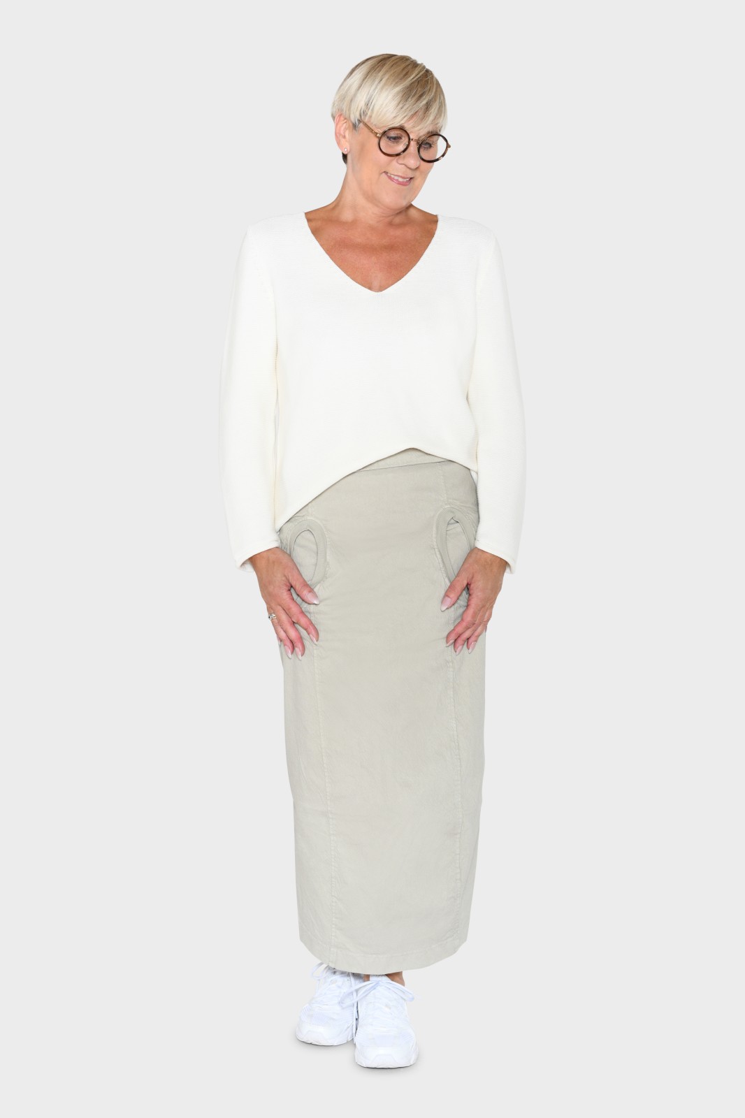 Denne elegante nederdel fra Rundholz er designet til den stilbevidste kvinde, der værdsætter en blanding af komfort og sofistikation. Denne casual sandfarvede nederdel fremhæver en slank silhuet og er ideel til både afslappet og semi-formelt brug.