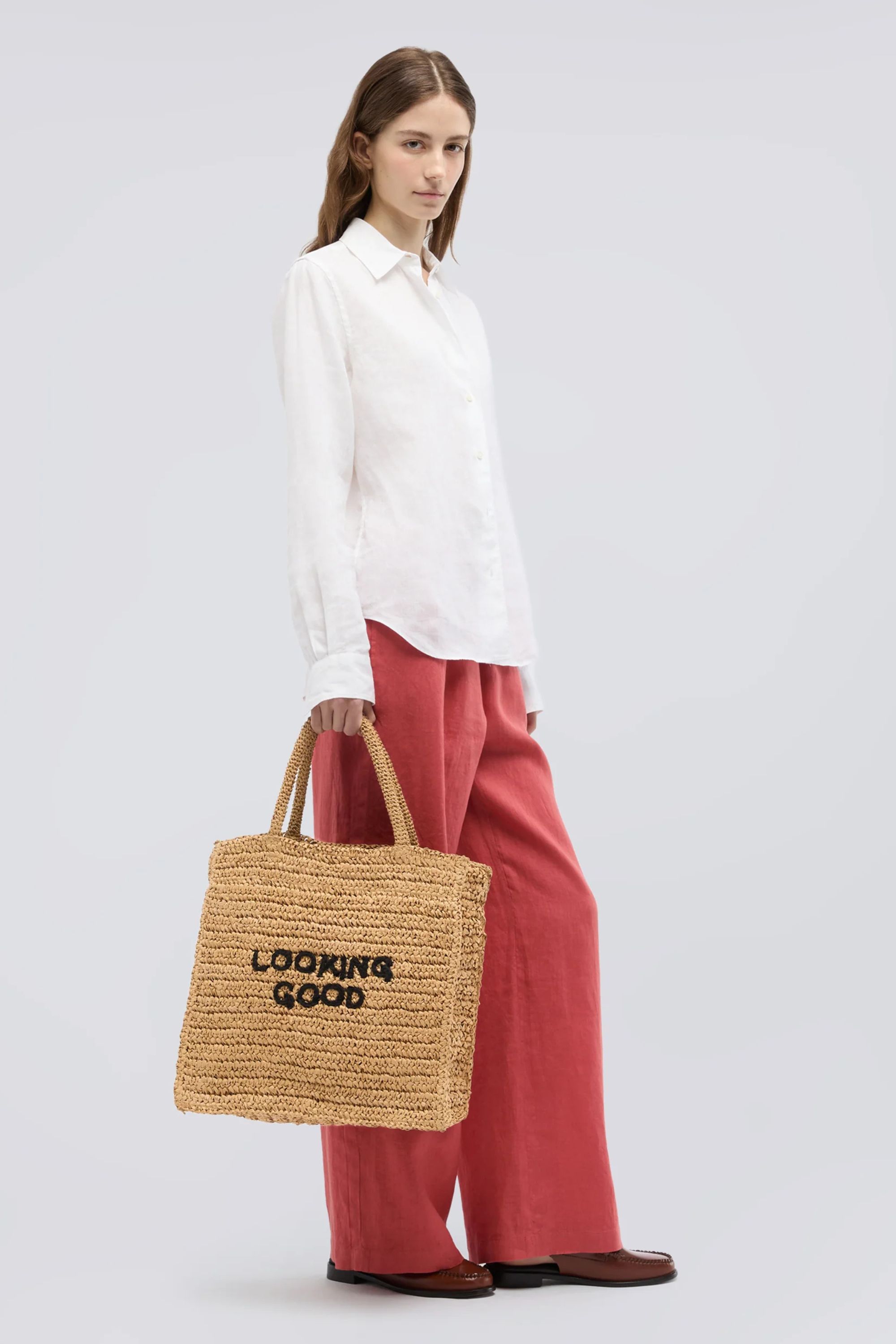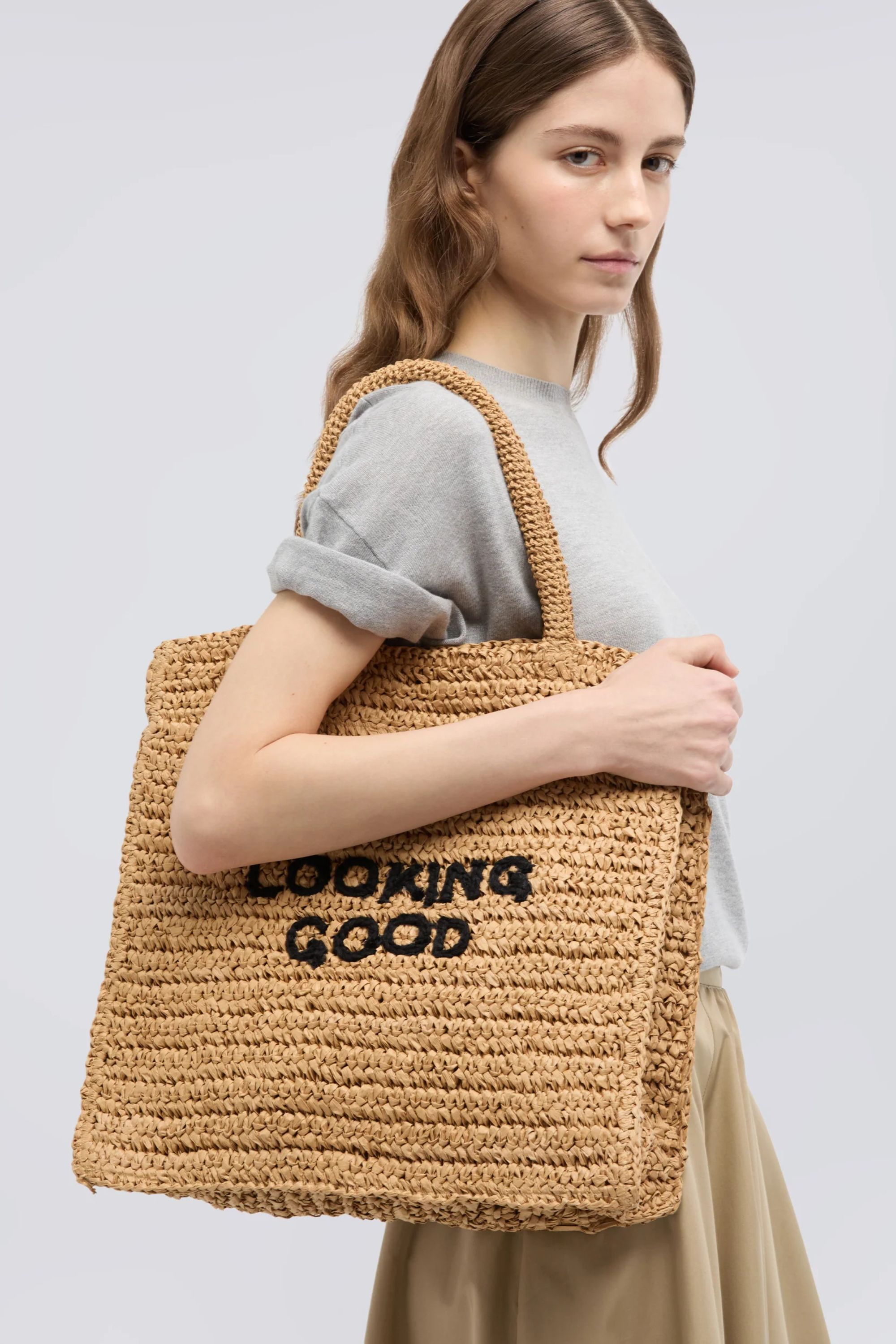Denne Raffia taske fra ASPESI er ikke kun praktisk, men også stilfuld med sit tydelige logo på forsiden og en legesyg tekst "Looking Good" på bagsiden. En ideel accessory til daglig brug eller en tur i byen.