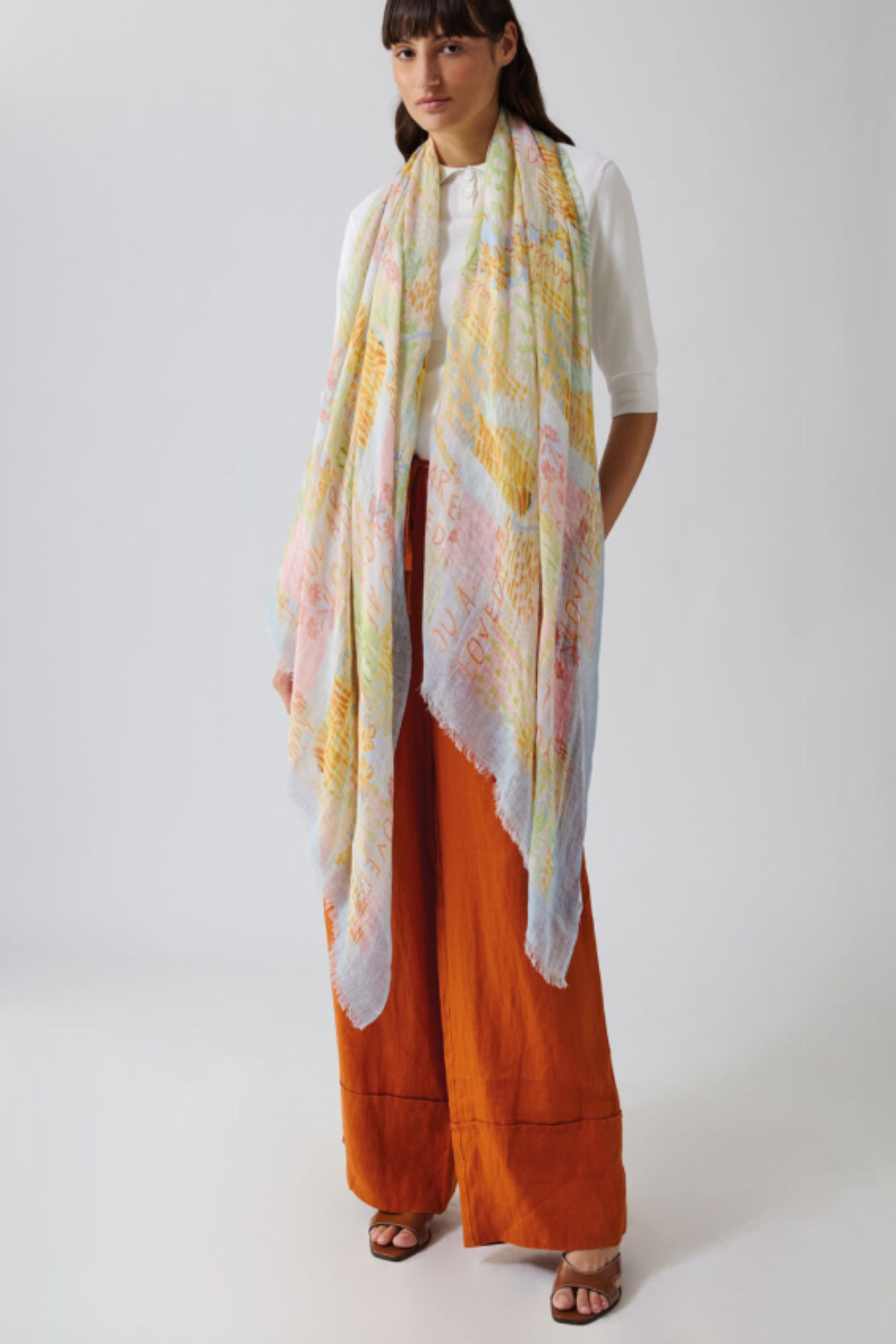 Opdag elegance og tidløs stil med dette flotte tørklæde fra 19 Andreas 47, perfekt til den stilbevidste kvinde. Dette rektangulære tørklæde prydes af frynser i enderne og et diskret mønster i smukke pastelfarver, der tilføjer et subtilt touch af farve til enhver garderobe.