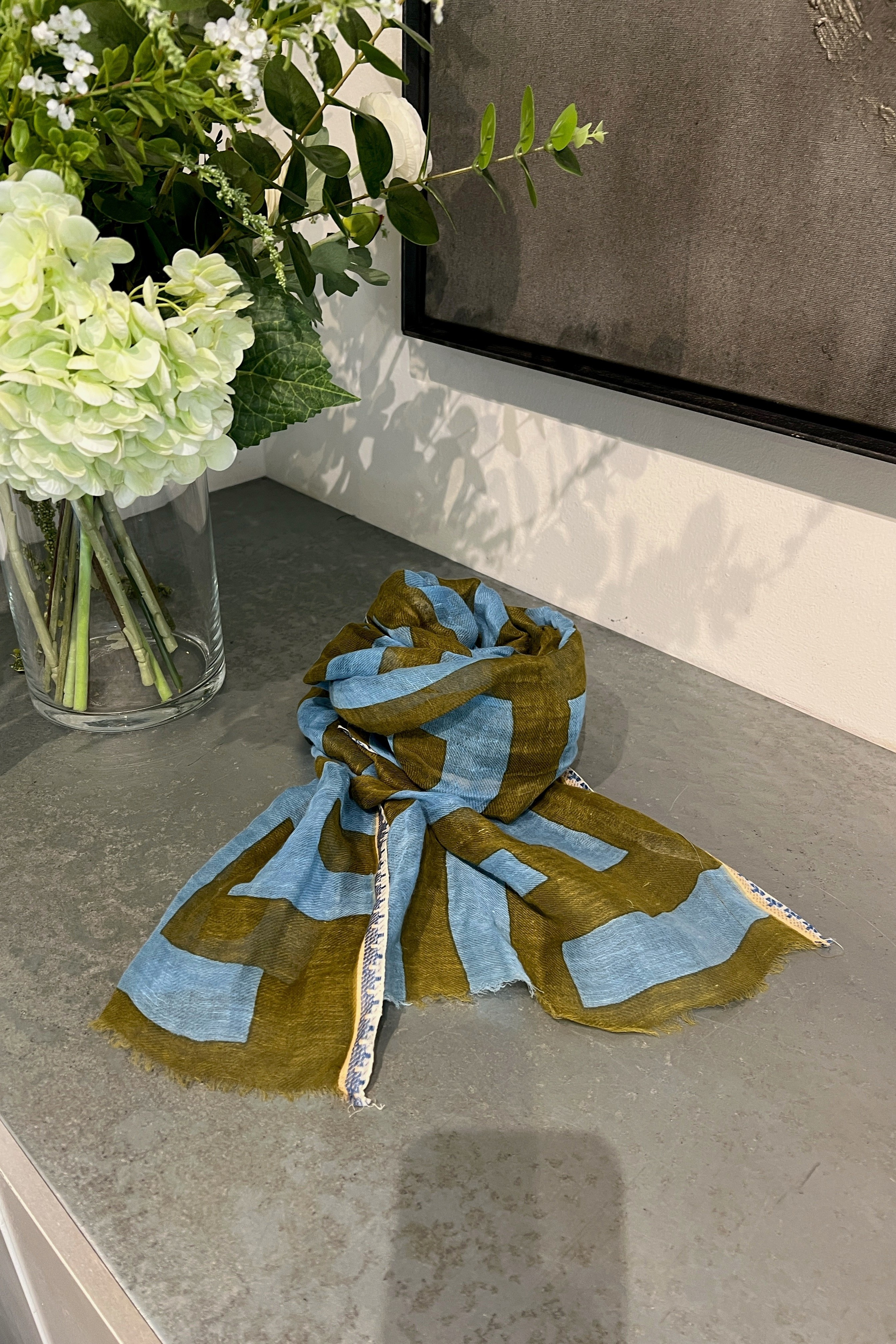 Med sine dybe nuancer af oliven og blå er dette tørklæde en alsidig accessory, der nemt kan styles over en enkel uldfrakke eller en klassisk blazer. Det fungerer perfekt som et farverigt indslag i garderoben, der binder dine forskellige outfits sammen på en elegant måde.