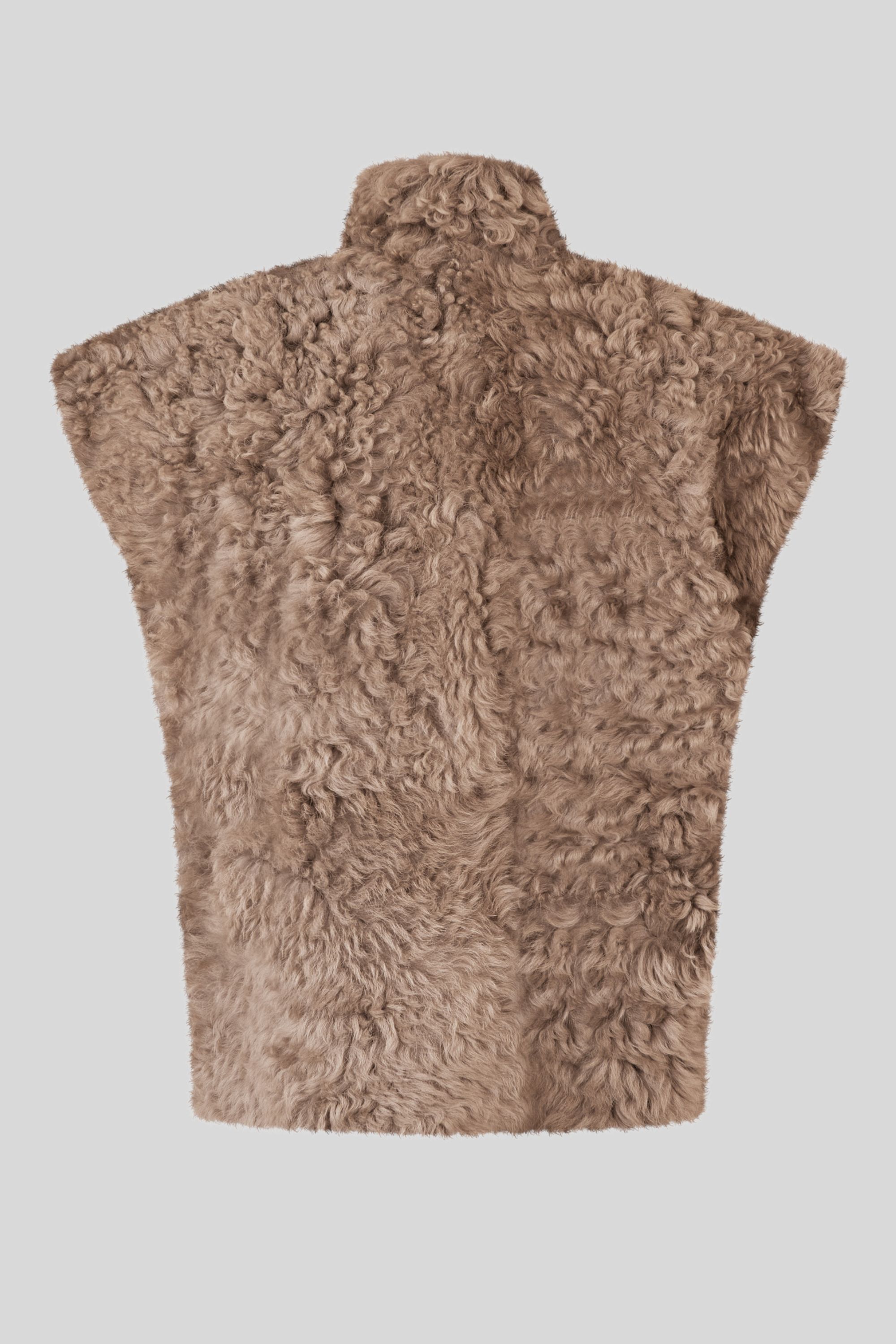 Denne elegante rulams vest fra Benedikte Utzon er et tidløst stykke, der tilføjer en luksuriøs dimension til enhver garderobe. Med sin vendbare design og neutrale lysbrune farve, er denne vest yderst alsidig og perfekt til at lag-på-lag styling, hvilket gør den ideel til både indendørs og udendørs brug.