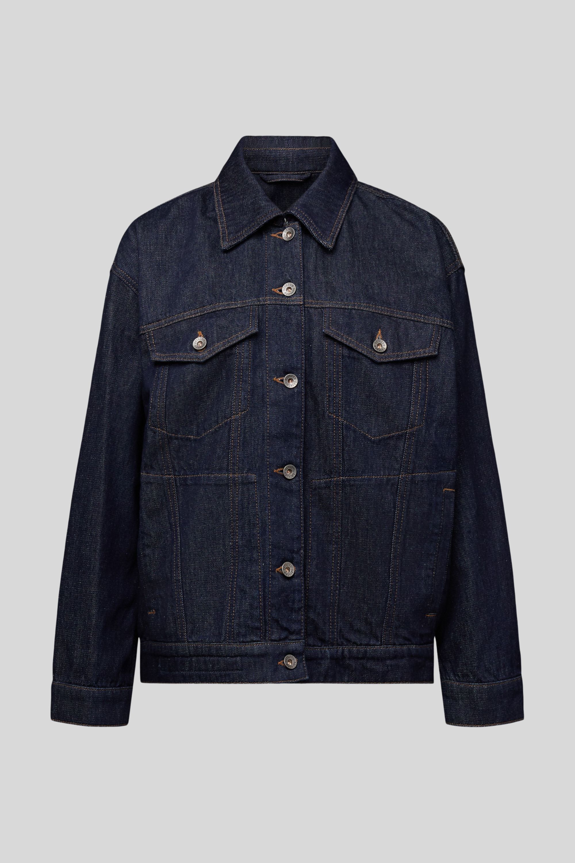 Kan reguleres i taljen. Har klassisk udtryk og snit som en cowboyjakke. Rummelig model. Kvalitet 100 % bomuld. Farve mørkeblå med orange stikninger. Størrelse 66 cm fra skuldersøm til kant forneden, brystvidde 63 cm i str 2. Vaskeanvisning 30 grader.